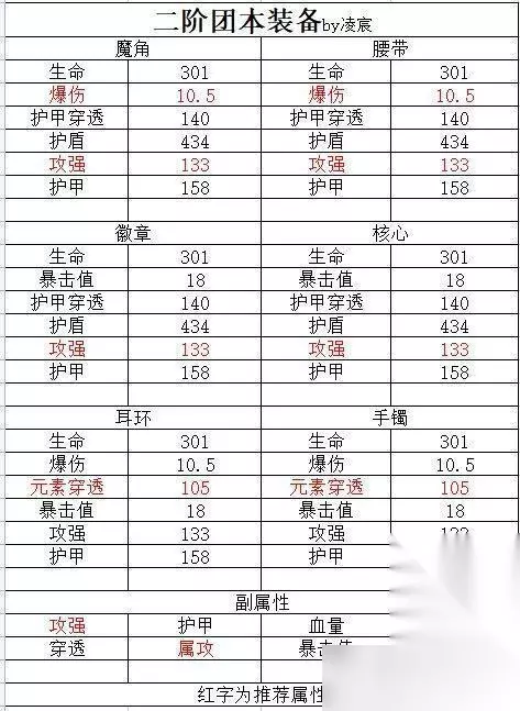 魔角:攻击强度/暴击伤害 核心:攻击强度 腰带:攻击强度/暴击伤害 徽章:攻击强度 耳环:元素穿透 手镯:元素穿透 副属性:攻击强度/暴击伤害/火攻