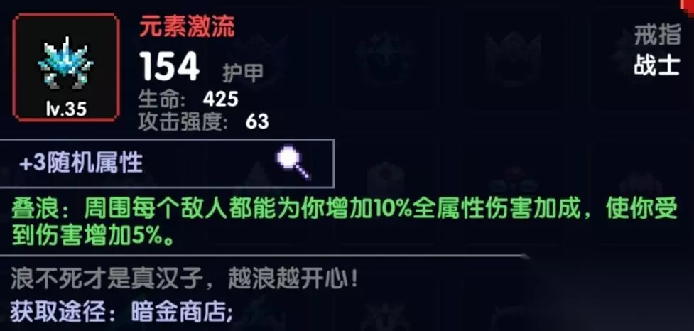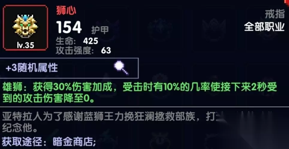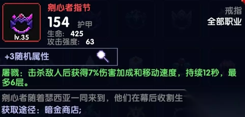 也是比较推荐的一个戒指30%全伤害加成,很无脑,也有一定几率防暴毙,不过更看重的是30%伤害加成,不要跟我说赌狗,赌狗??都不带嗷,这么跟你们说,这个戒指相当于从开始到结束你就拥有固定的6层赌狗,赌狗还要看脸,第一原则,概率的装备就别去碰!萌新一定要记住,要选择固定无脑加成的装备