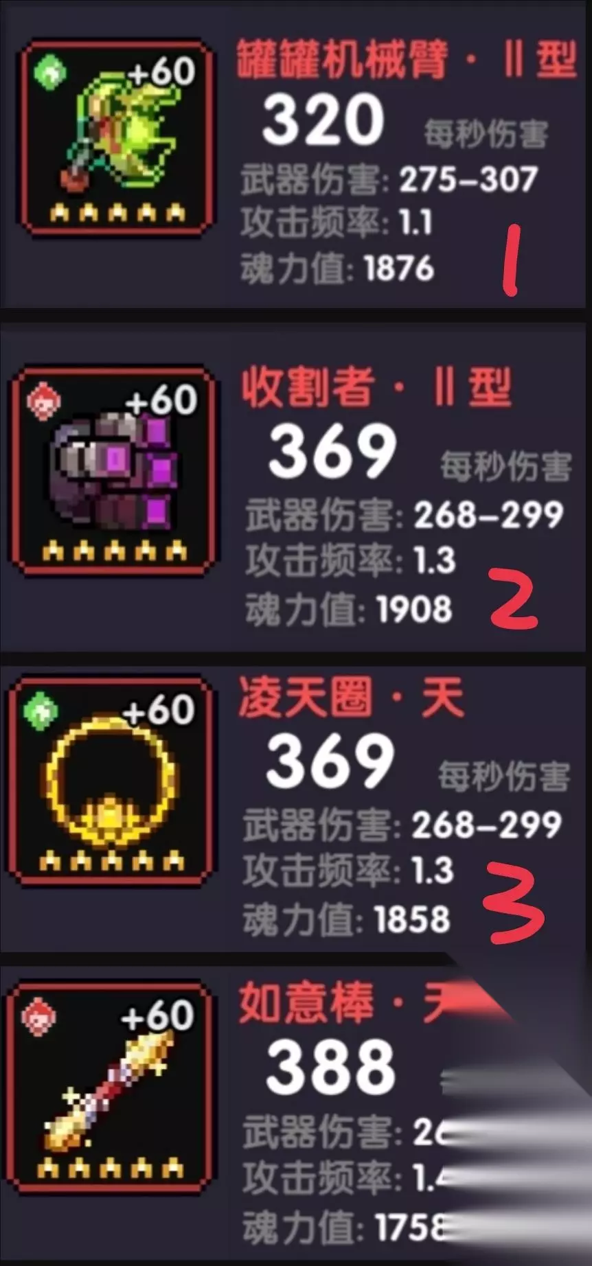 可以看到组队木限定组队的时候只能获得基础伤害+50,70%全伤和10%易伤,不如工厂120%全伤来的实在,单人很厉害,但是组队很亏,水限定前面的10%攻击强度和50爆伤就很香还有35%技能伤害,工厂满能量是66%技能伤害,31%技能伤害和10%攻击强度,50爆伤,这个换的话不亏也不赚大差不差,做一把水限定肯定是没问题的 总结一下:资源充足可以做水木限定,资源不足只做水限定就够用,萌新还是以天宫和工厂为主,毕竟单人组队都可以,新限定只是对单人加强而已,不想做完全可以不做忽略,若要带双限定武器,需要考虑到蓝量问题,宠物带企鹅或者长江52号 1号:穿透/爆伤/首领 2号:穿透/暴击/首领 3号:穿透/暴击/首领 4号:穿透/爆伤/首领 5号:穿透/首领/爆伤 6号:穿透/首领/暴击 推荐为通用属性,可以兼容世界boss和大秘境竞技场,还是那句话你想世界和竞技场更高分数,就直接把穿透洗成火攻亦或者是攻击强度 新人建议用3和4号武器,在符文能量比较低(1250和1360)的时候都是分别比前面1和2号收益更高 搭配:主武器+1+2或者主武器+3+4 二.魂珠