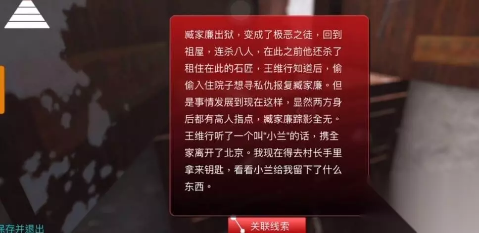 《孙美琪疑案:石门村惨案》一级线索——真相 一、真相 1、位置: 最终的真相将二级线索当中获取的两个留言的内容关联起来然后加上臧家廉的线索提示就可以得知背后的真相了,凶手就是臧家廉 留言1:点击查看 留言2:点击查看 臧家廉:点击查看 2、线索描述: 臧家廉出狱,变成了极恶之徒,回到祖屋,连杀八人,在此之前他还杀了租住在此的石匠,王维行知道后,偷偷入住院子想寻私仇报复臧家廉。但是事情发展到现在这样,显然两方身后都有高人指点,臧家廉踪影全无。王维行听了一个叫“小兰”的话,携全家离开了北京。我现在得去村长手里拿来钥匙,看看小兰给我留下了什么东西。