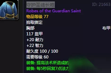 守护圣徒长袍:说到在魔兽世界怀旧服中最美的布甲衣服恐怕要属这个守护圣徒长袍,这个长袍外观实在太精美了,深受女性玩家的一个喜爱,之前安其拉神殿开放后,这个守护圣徒长袍是一下子成为了各种族牧师的抢手货,大家都来抢,毕竟实在是好看,而且这个装备的属性也是不差,首先白字属性是给到了117护甲值20耐力和22智力,非常均衡,另外绿字属性也是不耐,装备后可以加70点的一个法伤,以及每5秒回复7点法力值,