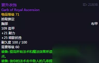 晋升衣饰:这个晋升衣饰也是一个性价比比较高的装备,我们来看看它的属性,作为一个布甲,这件装备给到了21点的耐力和25点的暗影抗性,白字属性,还算是可以的,尤其是暗影抗性在之后的6阶段里面是很重要的。另外绿字属性,则是可以增加法术伤害和治疗效果提升30点,而且还有一个2%的法术命中效果,这个对于玩家来讲非常重要。 以上就是小编今天给大家盘点的一些魔兽怀旧服这个游戏的史诗布甲胸装,对此,大家怎么看?欢迎大家发表自己的观点。