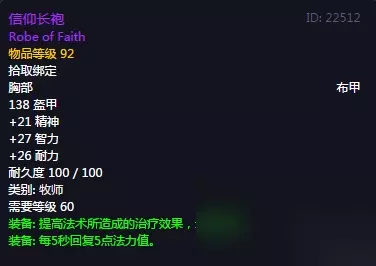 信仰长袍:这个信仰长袍可以说是怀旧服护甲值最高的一个长袍装备了,装备后可以提供138点的护甲值,而且这件装备的物品等级也是最高的,除此之外,还加21点精神27点智力以及26点的耐力值,这个白字属性可以说是相当出色了,另外绿字属性也是不差,装备后可以提供64点的法术伤害以及每5秒回复5点法力值。不过要想拿到这个装备,则要完成一个英尼戈蒙托尔神父的任务,需要准备的材料有1件被玷污的长袍、25块布衣碎片、4张月布和2块连结水晶。