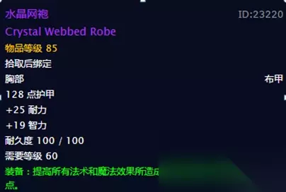 水晶网袍:这个装备掉落于纳克萨玛斯的世界首领迈克斯纳,属性这一块还是相当可以的。我们先来看看这个装备的一个白字属性,装备后给到的护甲值是128点,另外还加25点的耐力和19点智力,这个属性还是非常的均匀。再来看看这个绿字属性,装备后可以提升玩家的法伤53点,总体来讲还是一件性价比非常不错的装备,值得入手。