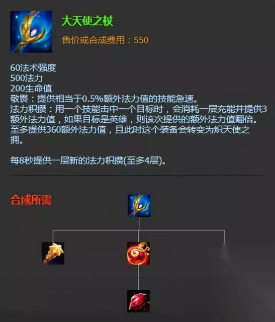 大天使之杖:前期可以早点出女神泪叠,发育为主,大天使法强高蓝量多。