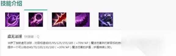 Q技能:指向性技能,在命中对手以后有加魔盾,针对AP非常猛,且可以打断引导技能(tp,卡特r,死歌r,稻草人r,泽拉斯r,龙龟q慎大招或者吸血鬼的E等等),但由于cd过长,除非是想消耗升三级q,一般情况只点一级;另外值得一提的是,Q技能可以破河蟹的盾,在我们中后期快速发育的时候刷河道蟹q起手破盾,使我们快速击杀,快速发育。