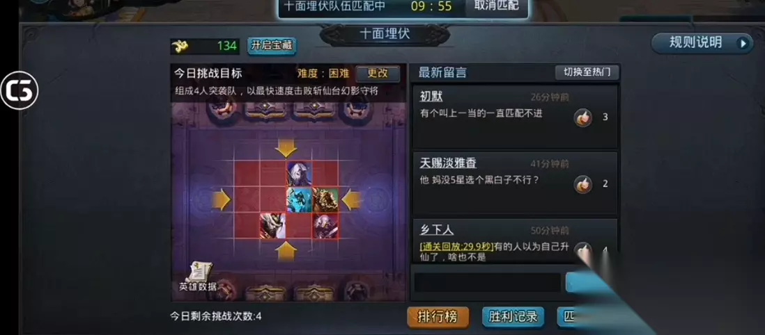 十面埋伏是一种需要4名玩家组队共同挑战5名敌方BOSS英雄的限时玩法。玩家需要根据战斗表现争夺伤害、防御和回血三种勋章,每个勋章可提供20分奖励,但单个玩家最多只能同时获得两个勋章。通过合理搭配英雄和调整站位,可以在限定时间内击败敌方英雄取得胜利。