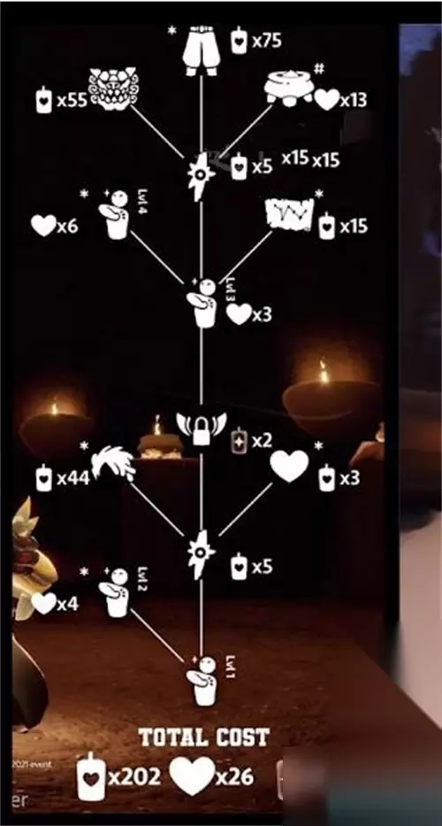 光遇当中玩家最喜欢的裤子就是武士库,最近就有一些玩家预测会复刻武士裤先祖,因为已经很久没有复刻过了,所以很多的新玩家不知道具体的武士库先祖兑换图是怎么样的,所以今天小编就给大家带来一期最新的武士库兑换图,希望能给大家带来一些帮助。 光遇武士裤兑换图分享 兑换道具:武士裤-75根白蜡烛,石狮子面具-55根白蜡烛,锡纸烫头-44根白蜡烛,一张乐谱-15根白蜡烛,随机魔法-10根白蜡烛,踹胸动作-13颗爱心,永久光翼-2根红蜡烛。兑换总计:202白蜡烛,2红蜡烛,13爱心。 具体兑换图: