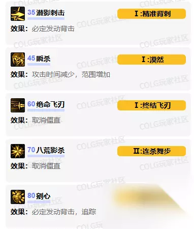 二、技能进化加点详解 35级 潜影刺击 → 精准背刺 效果:强制移动至敌人后方,100%触发背击效果(建议搭配瞬袭使用) 45级 瞬杀/瞬袭 → 漠然 效果:消除攻击后僵直,范围扩大30%(适合连招衔接) 60级 绝命飞刃/绝境飞刃 → 终结飞刃 效果:取消施放后僵直,自动追踪最强敌人,范围扩大50% 70级 八荒影杀 → 连杀舞步 效果:可无缝衔接瞬袭与死亡连舞,全程无僵直(建议作为核心连招技能) 80级 剜心/摧心 → 暗影摧心 效果:强制追踪敌人并100%背击命中(建议作为收尾爆发技能) 三、技能强化推荐 ⚡ 瞬杀/瞬袭:优先提升伤害(建议+35%) ⚔️ 剜心/摧心:平衡冷却缩减与伤害(推荐各-25%) ️ 绝命飞刃/绝境飞刃:最大化技能伤害(建议+40%)