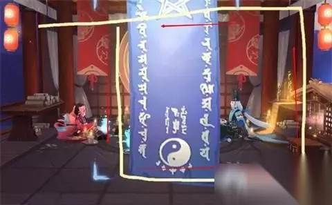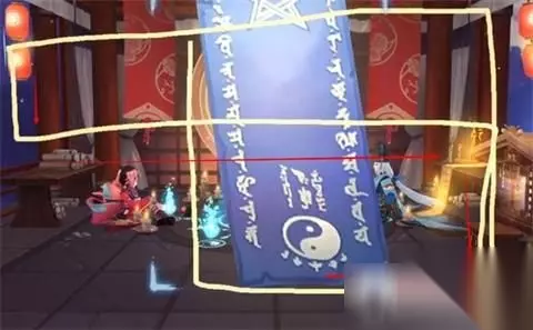 一直画到最左侧灯笼的旁边向下画,长队和红色的挂布对齐的时候拐弯,尽量保证这条划过来的直线贴上这两个红布的边缘,到右侧的直线贴合着拐弯。 一直画到蓝布的右侧符咒的地方想上画,画到连接处为止