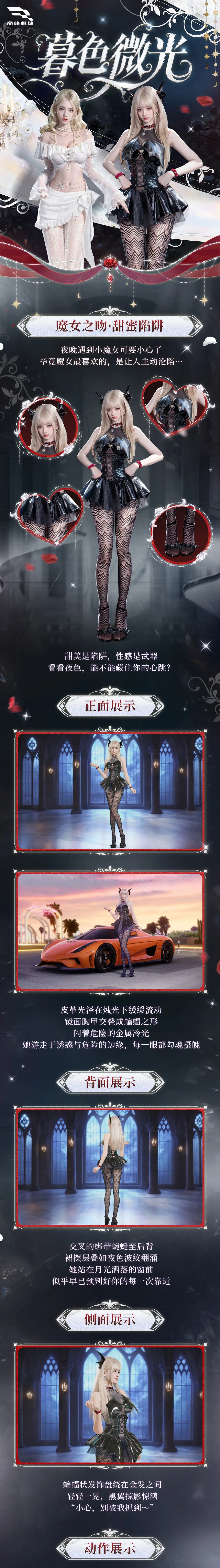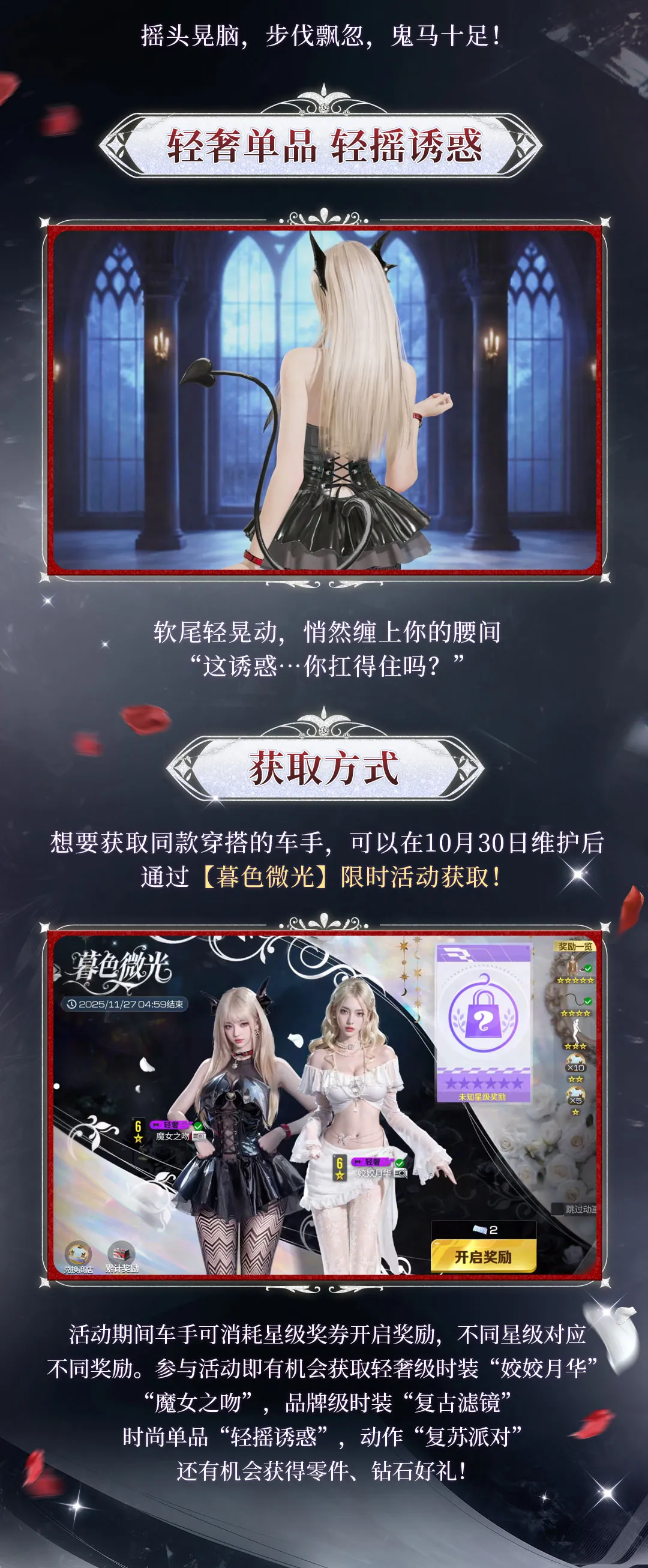 全新轻奢级时装 「魔女之吻」「姣姣月华」 将于 10月30日上线,参与【暮色微光】活动抽奖还有机会获得品牌级时装“复古滤镜”,零件、钻石等好礼!快来跟随小可,一起揭开这场极速与奇幻交织的派对吧~