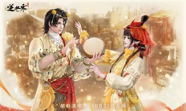 胡天行商珐琅珍,漠野踏铃彩绸招。10月31日(星期五)至12月5日(星期五),逆水寒西域商人主题时装【胡彩漠琅】限时上架商场,原价680纹玉,限时折扣【60纹玉】,支持半价券、代金券!
