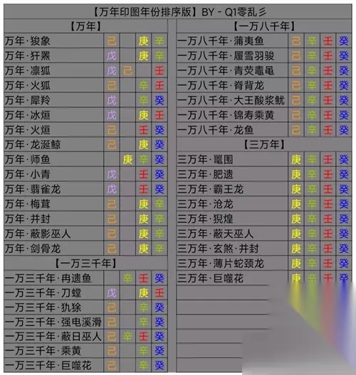 这次的万年印表汇总之后,更加方便小伙伴们进行观看。 同时考虑到新区轩辕剑可能开不了的问题,就把戊己加上了。 最后小伙伴们需要的可以直接将这个表格保存使用。