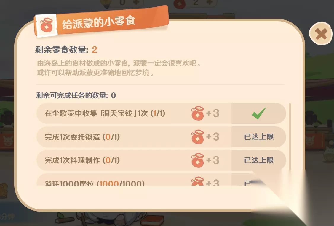 第一天获得3个灵感。 2.给派蒙的小零食,回答错误可以消耗小零食重新答题。