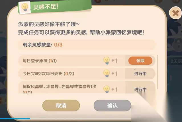 1.每日登录游戏,完成委托,(抓晶蝶,完成秘境,挖矿)可以获得灵感,消耗3个灵感解锁回忆。