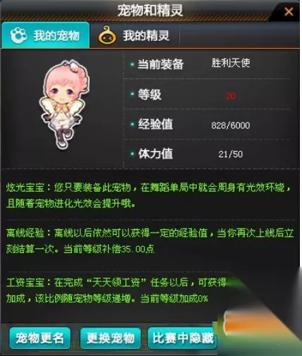 灵巧机敏的胜利天使最擅长在舞台上翩翩起舞,在舞蹈单局中带上她,周身便会有奇幻美丽的光效环绕。而且随着小天使的成长,光效也会愈加漂亮哦~ P.S:这位来自天国的小不点,总是能为车手们送上最诚挚的祝愿。善解人意的她用心守护主人,让心爱的主人在飙驰赛场时战无不胜。瞧!她的眼眸中可是盛满了对你的爱意,你的心是否已被甜美纯真的她所俘获了呢?外表可爱,一致吸引着大部分女性玩家。 关于这个宠物满级之后的技能也可以看看下面的介绍: 技能1:炫光宝宝 您只要装备该宝宝,在舞蹈单局中就会周身有光效环绕,且随着宠物进化,光效会提升哦。 技能2:离线经验宝宝 您只要装备该宝宝,在离线以后的时间里依然可以获得一定的经验值,该离线经验值以离线小时数计算,当您再次上线后立刻结算一次。 技能3:工资宝宝 您只要装备该宝宝,在完成“天天领工资”任务以后,可获得一定比例的工资加成。该加成比例随宠物等级的提升而提升。最高等级可获得11%工资加成喔。