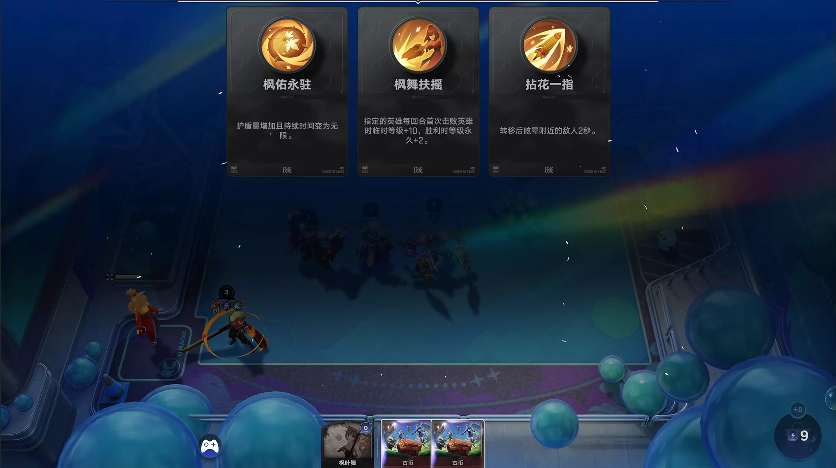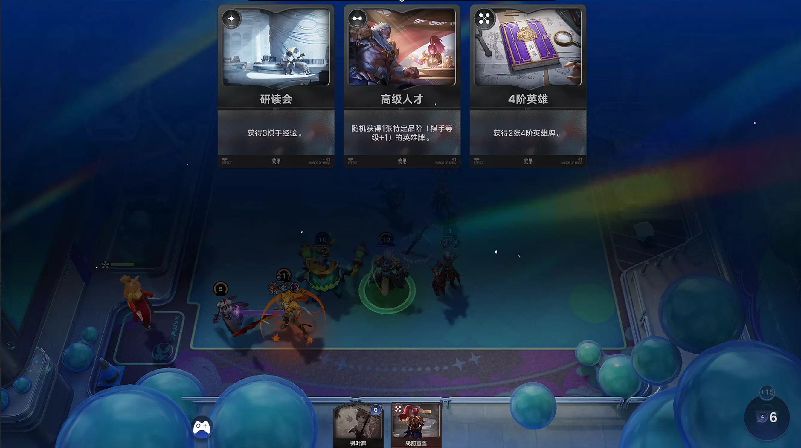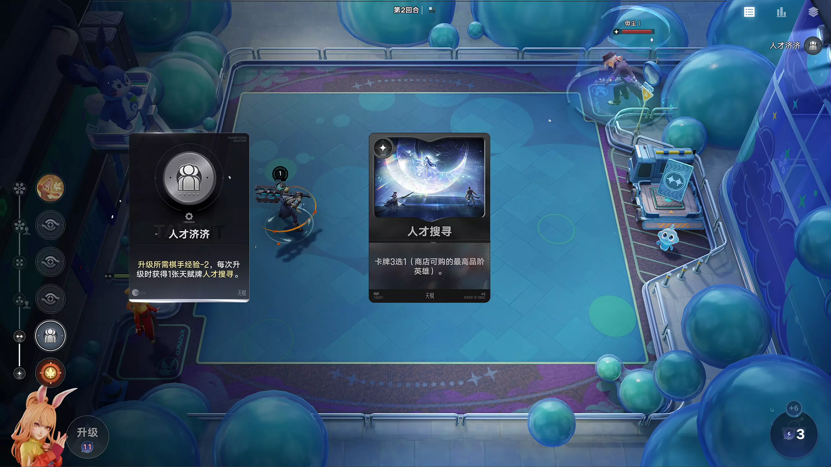 棋手在升级时能随机获取天赋牌,给对局增加强力增益效果。牙膏光信酱在升棋手2级时,拿到的【人才济济】天赋牌就成功帮他在第五回合就拿到了四阶关键卡牌-李信!