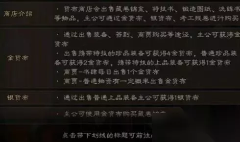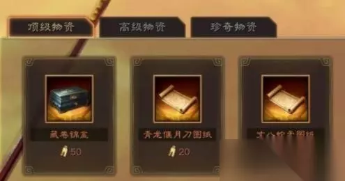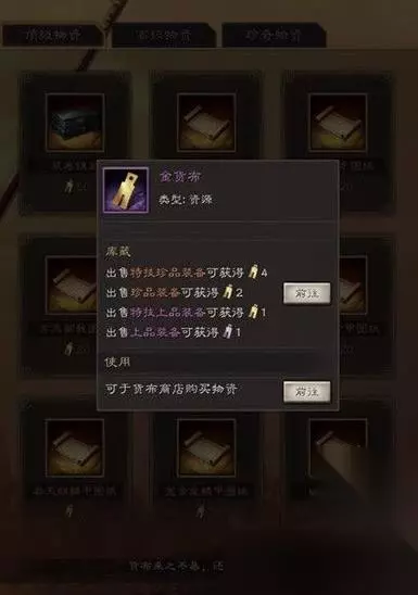 3、顶级里面装备图纸20金货布一张,锦盒50金货布一个,珍奇残卷是要开锦盒出的 4、货布商店出来后给了玩家一个新的奋斗(肝)方向,想要的特技大部分都有