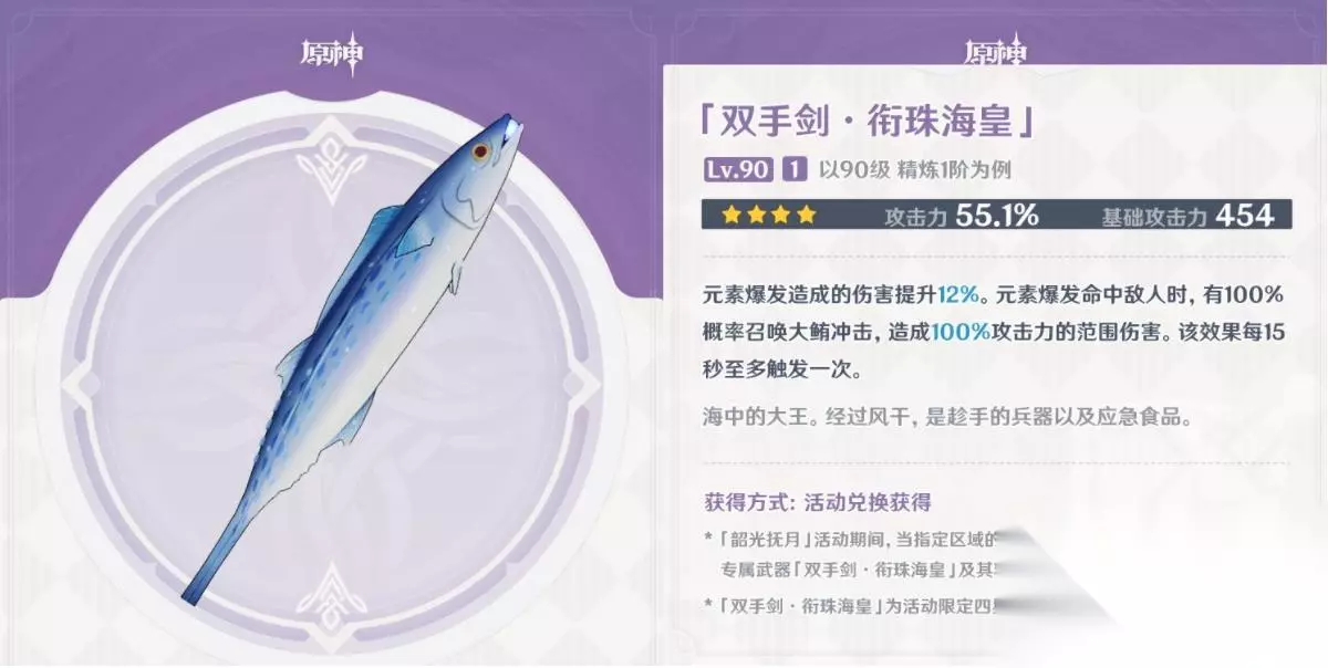 标签: 大剑 原神咸鱼大剑怎么获得?原神逐月节中,咸鱼大剑凭借其独特的外形,吸引了玩家的眼球,很多小伙伴想知道如何获取,下面就由小编带来原神咸鱼大剑获得方法。