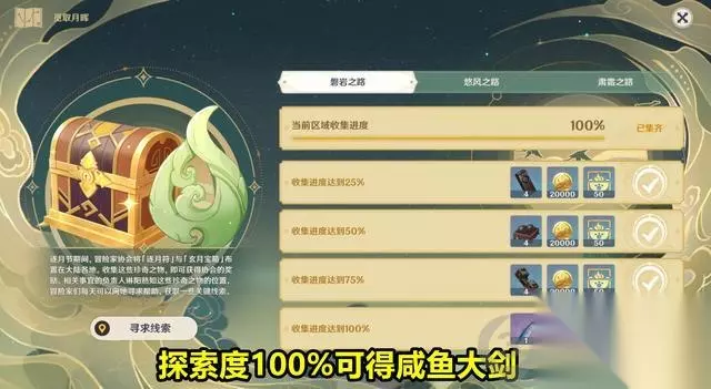 璃月的冒险家协会在璃月地区布置了大量的宝箱和逐月符,每一个宝箱内都有原石,我们的任务就是收集完所有的逐月符,并开启所有的宝箱,将探索度推到100%,然后就可以获取包括“咸鱼大剑”在内的所有奖励。