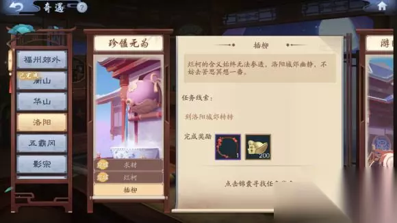 洛阳-游园惊梦 1、关雎 激活条件:完成主线[竹林幻境] 证明你家人多 解决方式:同时邀请2个好友拜访自己的府宅转一圈就行 2、绸缪 激活条件:完成奇遇[关雎] 爱护环境 解决方式:府宅清理垃圾 3、常在 激活条件:完成奇遇[绸缪] 证明你的臂力 解决方式:打水漂进度条到头扔出去 4、新词 激活条件:完成奇遇[常在] 认真的侠客做的什么都很完美 解决方式:侠客派遣任务出完美达成 新笑傲江湖叶落无声奇遇任务怎么做 1、叶印 在去往五霸冈高崖的路上,时不时会有微风吹过。 激活条件:完成主线【功亏一篑】 在交易行证明自己的财力(在交易行累计消费1万银子以上) 2、别离 上次遇见的那个黑衣女子所用之毒似乎和五仙教之毒非常相似,不如到五仙教营地附近找找看她的线索吧 激活条件:完成奇遇[叶印] 在琴箫比赛中证明自己的手速(在琴箫比赛中完成一次全连) 3、向往 繁叶有着悲惨的过去,不知回到五仙教的她现在如何?不如有时间再去找找她吧 激活条件:完成奇遇[别离) 增送好友三件漂亮的外观 新笑傲江湖山根子奇遇任务怎么做 1、鼓路 激活条件:在洛阳将【山根子】捉拿归案 结识桃谷的朋友(结识桃谷六仙侠客) 2、敛财 激活条件:完成奇遇【歧路】 认识很多质害的侠客。 3、囹圄 激活条件:完成奇遇【敛财】 证明你家人真的很多。 新笑傲江湖长相守奇遇任务怎么做 1、孤身 少室山下的酒肆中,总少不了闲谈的山民…… 激活条件:完成主线【禅宗来客】 看过的江湖动态记得要点赞(江湖动态中给他人点赞) 2、期盼 听说洛阳来的货船延迟了几日,最近就快要抵达少室山了,去江边看看吧 激活条件:完成奇遇【孤身】 好朋友可以睡一张床(家园中与好友互动) 3、世安 少室山下的废屋旁,似乎有人遗失了贵重的物品。 激活条件:完成奇遇【期盼】 在吗?一起洗澡?(在家园中与好友互动浴缸) 新笑傲江湖五霸岗奇遇任务怎么做 1、抱瓮老人 古书:提升等级不急,慢慢来,什么时候到了就会完成 残卷:简而言之就是花钱 白昼梦:妙手丹青任务完成5次 2、渡江遇险 残书:掉落的书卷(628,569) 初险:(再找了) 再险:宠物学会技能(77级开启技能) 3、叶落无声 叶印:花钱 别离:琴箫比赛要快吧 向往:简而言之就是花钱买衣服送别人,还是花钱