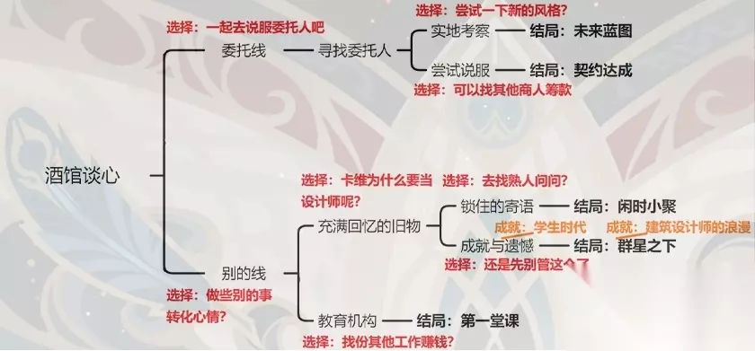 玩家打开任务邀约,进入“酒馆谈心”事件,在剧情中选择“做些别的事转化心情?”,再选择“卡位为什么要当设计师?”,然后选择“去找熟人问问?”,会解锁“闲时小聚”结局。玩家打开任务邀约,进入“成就与遗憾”事件,选择“还是别管这个了”,会解锁“群星之下”结局。玩家打开打开任务邀约,进入“酒馆谈心”事件,选择“做些别的事情转化心情?”,然后选择“找份其他工作赚钱?”,会解锁“第一堂课”结局。