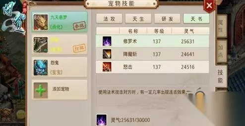 天书灵气 除了以上几点,宠物天书还有一个很重要的数据就是“灵气值”。宠物每次攻击时如果触发了对应天书的效果,即会消耗一定数量的灵气值,灵气值为0后天书效果将无法生效。 天书的灵气值上限为30000,而一本新装备的天书,其灵气值为6000,因此,就需要道友们使用其他的天书来给装备的天书补充灵气,每消耗一本天书即可补充6000灵气值。需要注意的是,使用与目标天书效果不同的天书,也是可以补充灵气的,并不需要使用与目标同样的天书哦。 尽忠:宠物在受到忠诚度降低操作时有一定几率使此次降低的忠诚度有一定比率的降低。