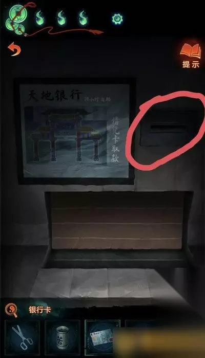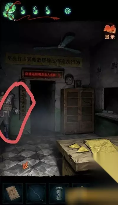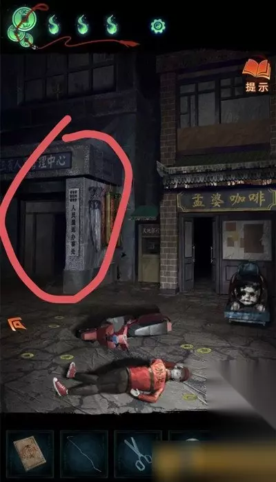 12、把吊牌挂在管理中心大门上,就可以进去了,进去后点击桌子上的黄色纸片,用剪刀完成小游戏(充电宝手机上的线索)就可以拿到纸钱。