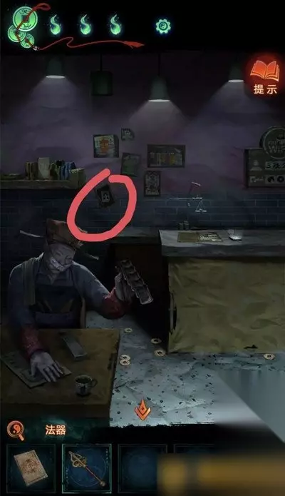 16、回到咖啡店,用魔术师和剪刀拿到墙上的照片,再回到空白的桌子上用照片,再盖章,拿到冥籍。