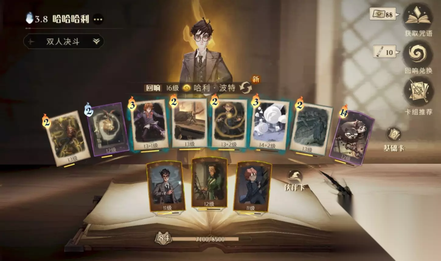 ✨基础卡:三头犬宝宝,飞沙走石,昏昏倒地,万弹齐发,雪球咒,变形咒,飞天扫帚,云雾缥缈。 ✨伙伴卡:哈利·波特,米勒娃· 麦格,鲁伯· 海格。 ✨介绍:主要依靠变形咒+雪球咒,万弹齐发+飞天扫帚来打主要输出,昏昏倒地和飞沙走石辅助输出和解场。 ✨回响:尽可能有卡牌加成。 ✨队友卡组建议:低费哈利,多比打球,闪电赫敏。 ❄对局思路: ✨1.使用飞天扫帚+万弹齐发或变形咒+雪球咒来消耗对方血量,然后来到角落放哈利。(尽量平均消耗,或是和队友只打对面一个。) (PS: (1)如果对方带了犀角兽,那么昏昏倒地就要捏在手中等到对方释放犀角兽后再使用。 (2)如果对方为多比,那么尽量不要用雪球咒和飞沙走石,因为基本打不到。在对方刚刚瞬移完后使用昏昏倒地和或者万弹齐发+飞天扫帚,可以大幅度提高命中率。需要注意多比的残影。) ✨2.等伙伴卡冷却结束,魔力来到9点,同时三头犬宝宝魔费在4费以下时,来到角落释放麦格,然后每隔2秒左右释放一次魔咒并在三头犬宝宝0费时召唤出放在麦格前面挡伤害,这样可以有效地减缓麦格的前进并有大概率可以召唤出石墩,和队友一起配合麦格进一步削减对方巫师们的血量。 ✨3.情况一,对方巫师血量都来到了400-500左右,己方双人魔力5点以上,和队友配合击杀其中一位,然后准确释放飞沙和变形咒打断另一人的拉人,并对其进行击杀。情况二,配合队友优先击杀敌方一名巫师三次(算上被拉起来的2次),然后再击杀另外一名巫师。 ❄卡牌替换: ✨变形咒可以替换成充气咒,速速禁锢(可以配合雪球咒快速清理多个召唤物)。 ✨云雾缥缈可以替换成金色飞贼。(换之前确保你队友身上有云雾缥缈!) ✨罗恩· 韦斯莱在比较害怕烟花的情况下可以替换成鲁伯· 海格。 双人决斗技巧 ❄弗立维 ✨1.这套卡组的主力是降调石墩和棋子士兵,所以音阶不能乱。 ✨2.如果队友也是弗立维的话两人依靠562音阶回蓝会让己方动物园成型加速。 ✨3.稳扎稳打,由于动物园很难同时打死两人,所以不用在意对方的血量,自己专注的躲技能和不停升调降调即可。 ❄卢娜+卢娜 ✨1.站在一起轮流释放统统加护,足以让对方无从下手(对面是烟花的话就别这么干了)。 ✨2.释放海格后,一定要让队友也上车(烟花赫敏看了就泪流)。 ✨3.丹尼尔可以在自己和队友都有龙蛋时释放,同时搭配上白鲜香精和统统加护确保龙蛋的孵化。 ✨4.由于缺乏斩杀能力,所以稳扎稳打很重要,不要急于一时而胡乱释放魔咒。 ❄低费哈利+低费哈利 ✨1.低费哈利1释放变形咒+雪球咒后低费哈利2接上雪球咒+变形咒,然后一起接上昏昏倒地,可以打出一波接近2000血的小爆发。 ✨2.在对方血量都达到收割线时,攒费并攒技能,然后再开启斩杀。 ✨3.低费哈利1或低费哈利2的麦格位置和第三张伙伴卡对调。(例子:低费哈利伙伴卡顺序为:哈利·波特,米勒娃· 麦格,鲁伯· 海格。 低费哈利伙伴卡顺序为:哈利·波特,罗恩·韦斯莱,米勒娃· 麦格。)