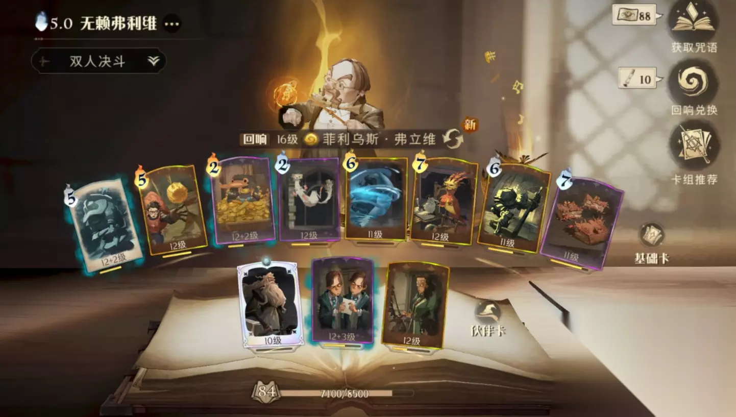 ✨基础卡:棋子士兵,金色飞贼,嗅嗅,变形咒,水牢,凤凰,石墩出动,三本妖怪书 ✨伙伴卡:阿不思·邓布利多,弗雷兄弟,米勒娃·麦格。 ✨介绍:用凤凰来压缩卡组,然后依靠金色飞贼和嗅嗅获取更多魔力,利用三本妖怪书,石墩和棋子士兵的召唤物组合让对方消耗不定量魔力,最后形成魔力差获得优势。 ✨回响:棋子士兵+2的情况下有其余的加成。 ✨队友卡组建议:765弗立维,卢娜,双子,海格。 ❄对局思路: ✨1.开局时核心在于金色飞贼和嗅嗅的运转(由于手上魔咒不一定是想要的,所以无论是降调还是升调皆可,但是要把嗅嗅和金色飞贼加入从而快速过牌并获得魔力),然后升调到凤凰(7)然后等待魔力来到10点后释放邓布利多,然后释放石墩出动(6)和棋子士兵(5)获得复活(之后的魔咒顺序看PS1)。 PS1:7(三本妖怪书)-6(石墩出动)-5(棋子士兵)-6(水牢)-2(嗅嗅/变形咒,释放2费时接近队友这样两人都会获得回魔,但是需要注意赫敏的烟花)-5(金色飞贼)-7(三本妖怪书)。 ✨2.依照上面的顺序不停的铺场同时升调的子弹也能消耗对方血量,在弗雷兄弟CD好了之后直接配合石墩和棋子士兵释放(前面有多的召唤物当然更好)。 ✨3.麦格教授的CD冷却后来到角落释放(这时候基本已经是魔力加速时间了),远离麦格教授,然后开始7-6-5-6-2-5-7音阶的不断释放,直到对方死亡。 ❄卡牌替换: ✨变形咒和凤凰可以一起替换成一个3费,一个4费的魔咒,比如烟花盒,充气咒,神锋无影,飞来咒,气象咒,八眼巨蛛的毒液等。(盔甲护身如果正式服也改成3费也能加入。) ✨弗雷兄弟可以替换成鲁伯·海格或者罗恩·韦斯莱。 ❄解场流奶盾卢娜(尽可能堆高平均卡等)