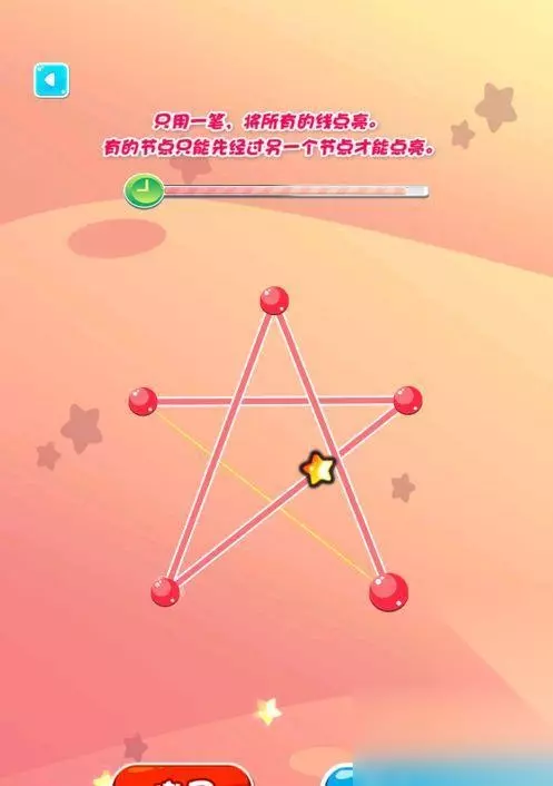 1关:小花轮廓 在屏幕中央出现一个小花的轮廓,玩家需要用鼠标一笔画出花的完整轮廓。注意:不可重复经过已画过的线段。 2关:简单房子 在屏幕中央出现一个简单的房子,玩家需要用鼠标一笔画出房子的完整轮廓。注意:不可重复经过已画过的线段。
