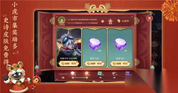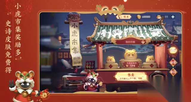 小虎市集活动将在25号也就是明天更新后开启,主要是参与获得从而获得小虎币,小虎币是用来兑换免费皮肤的主要道具哦。 并且也是刷新礼盒,礼盒内含有皮肤卡和道具卡,开启后有永久皮肤和各种其他的奖励,特别是荣耀积分,春节期间积分抽奖会进行打折的哦!