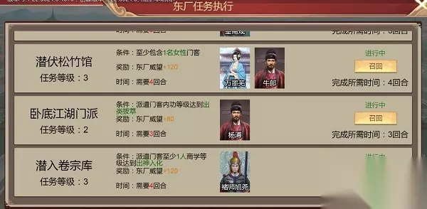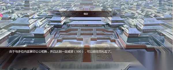 2.参加完朝会后,4月及7月,会有传话公公通知前往司礼监,说明朝会事务。对话司礼监掌司最后选择送礼,最大亲密度是选择笑纳800两。 3.亲密度达到友好还会出现拜访自宅事件。与司礼监掌司达到亲密后可结识司礼监秉笔。 4.司礼监秉笔会在夜晚前往自宅,下发任务,对能力及属性有一定要求,可派遣门客前往,任务结束,奖励司礼监威望,与秉承亲密度增加。 5.结识司礼监秉笔后即可前往东厂执行东厂任务。通过执行任务获取东厂威望,威望达标解锁相应职务。职务对眼力及体术有要求。