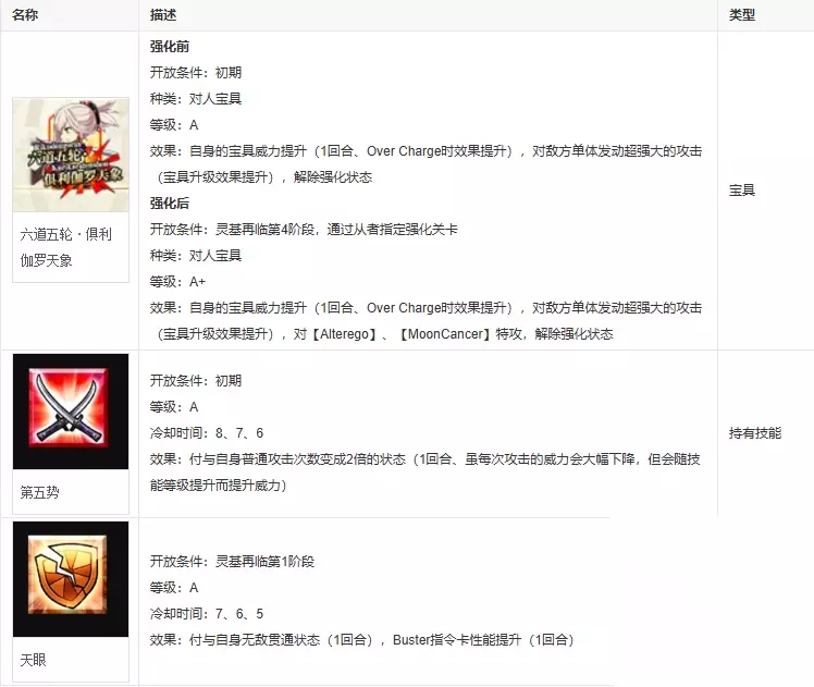 以日本历史上最强剑豪著称,江户时代初期的剑术家。精通号称由武藏创始的流派“二天一流”,运用大刀与小刀的“二刀流”达人。……本应如此,但与正确历史上的武藏情况似乎有些不一样。 “哎?这个世界的武藏是男人?而且还超级有名,太令人惊讶了!” 对胜利与名誉没什么兴趣,好酒,财迷,抵挡不住吃白饭的魅力。但与她较量,并输给她的人都这么说。 ——艳丽的天元之花。其剑,能达无空之高度。 牵绊故事一: “正式的名字?新免武藏守藤原玄信。但是,还是直接叫武藏比较方便嘛。” 牵绊故事二: 在正确的史实中,出生于作州(现冈山县美作市)1584年生。父亲是侍奉竹山城主新免家的武术指导师,被主家赐予了新免之名,被誉为新免无二斋的武艺高手。新免无二斋在吉野乡宫本村建立了十手术道场,武藏也将此地视为故乡,因此之后以宫本为姓。成人后留下了众多传说故事,尤其是在二十来岁的这十年间,与众多武艺高手战斗,这些著名的战斗也成了如今娱乐节目的热门题材之一。然而这十年间的战斗的真正内容几乎全都成谜,被人们深深怀疑乃是杜撰的。 牵绊故事三: 开朗活泼,凛然而又娇艳的女性剑士。总是春风得意,泰然自若,但并不会看不起对手。只是很享受人生罢了。感情表现略有些夸张。常会笑,常会惊讶。对大多问题都会一笑而过,性格豁达大方,但本质却是“钻研剑道之人”,在事关人命的问题上,是非常冷漠、严厉的。 话虽如此,却很容易着迷,最喜欢被人依靠。也最喜欢被人夸奖。禁不住赞辞。喜欢打架的大姐气质。虽然是正义之士,但自己不会主张正义。基本是个飘浮不定无忧无虑的流浪者,但遭遇“单方面虐杀”、“为了娱乐,践踏人的尊严与信念”、“在人饿肚子的时候抢走食物”这类情况时,就会修罗化。 牵绊故事四: 天眼:A 天眼被视为“达成目的的力量”。一旦决定要完成某件事,就会全身心投入,保证目的必定达成。也可以说是将自己的全部存在寄托于视线上,并投射向目的地的能力。不过武藏只会将天眼用在“斩这个地方”这种事上。比如说,一旦她决定“切下对方的右臂”,那最后她会不惜使用任何手段都要切断对方的右臂。那将会成为最合理的斩击,“没有任何多余,制服时间与空间的一刀”。将“为达目的使用的手段”范围“缩小到一种”的力量。将本应无限的未来限定成“只有一个”的结果,可以说是极为特殊的魔眼。 牵绊故事五: 无空:A 剑术家能到达的最高位。究极的境界。相当于柳生新阴流・水月。因无空,故无敌。能捕捉此物者,只有抵达无限境界的剑术家。 五轮之书 武藏临死前将自己毕生到达的境界,以及钻研的技法整理撰写而成。这是一套分为地水火风空5卷的书籍,是“武藏”这个人集大成的存在。五轮之书中,地之卷描写了二天一流兵法的理念与概略,水之卷则描写了具体的技法,火之卷是关于从战略或战术角度而谈的兵法,风之卷是对通过否定特定技与战法,让读者以“脑海中主动浮现出”的形式,从根本上理解二天一流的解说。而最后的空之卷,据说是用名为“相对”的技法,将武藏个人对“空”的理解撰写而成的东西。 最终故事: 六道五轮・俱利伽罗天象,等级:A,种类:对人宝具,有效范围:2-20,最大捕捉:1人 Rikudougorin Kurikaratenshou。剑轰拔刀。武藏维持着二刀流泰然自若地摆出架势,从背后仁王的地·水·火·风剑压(看上去是仁王发动的攻击)中,释放出用武藏尚未学会的【空】之概念、【零】之剑发动的究极斩击。 说是对人宝具,本质实际上是对因果宝具。甚至能将所有非业、宿业、诅咒、悲运一刀两断的佛之剑。 【是将存在削落至究极、无法进一步削落后,仍然残留的“某种存在”。】 被称为无二的究极之一。位于更进一步位置的零……的概念。天元之花不断追求,只为抵达此座。 能力设定: