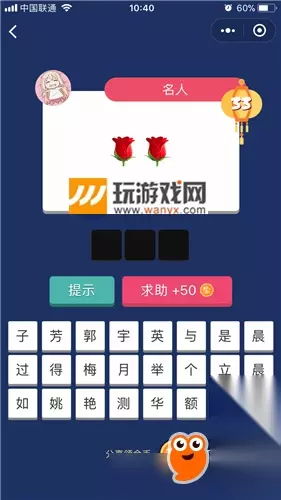 33关是让大家猜一个名人,图中提示良多玫瑰花,很多小伙伴都猜不出来是哪个名人,那么疯狂猜表情GO第33关怎么过?下面一起来看看~ 微信疯狂猜表情GO答案大全 丨 下一关 疯狂猜表情GO第33关答案介绍