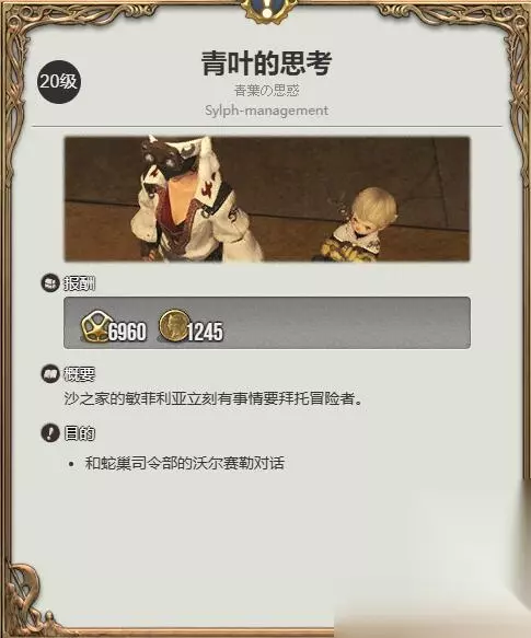 2、沙之家(6.9.6.1)处找【敏菲利亚】接取20级任务【青叶的思考】并完成。
