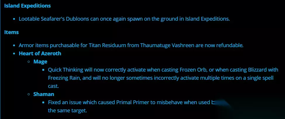 海岛探险 可拾取的海员达布隆币又会在海岛探险的地图上刷新了。 装备 从魔法师瓦里西恩那用泰坦残血精华购买的艾泽里特装备现在可以退货。 艾泽拉斯之心 法师 在施放寒冰宝珠或在冰冻之雨是现在能够正确的激活敏锐思考,并且在一个法术施放过程中,不会再错误地激活多次。 萨满 修正了当多名玩家对同一目标施放用原始知识时会发生错误的情况。