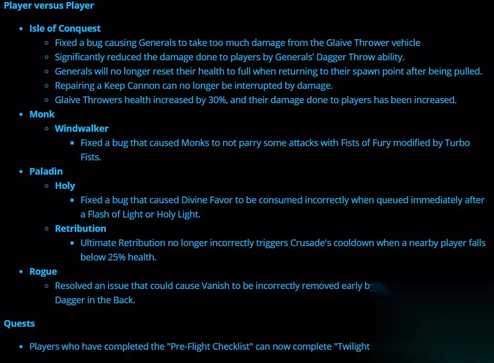 武僧 踏风:修复了武僧怒雷叶轮的怒雷破不会招架某些攻击的错误。 圣骑士 神圣:修正了在施放圣光闪现或圣光术之后立即施放神恩术会被错误地消耗的问题。 惩戒:当附近玩家血量低于25%的时候,终极惩戒不再错误地触发征伐的CD。 盗贼 修正了消失会被影中暗刃等艾泽里特特质错误地提前移除的问题。 任务 完成“预飞检查表”的玩家现在能够完成“暮光天空”。