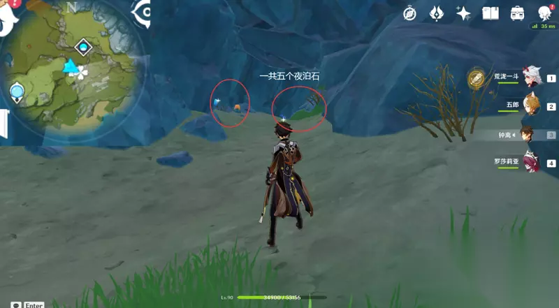 路线7:3个夜泊石 到采樵谷左边传送点的位置,之后就可以向着地图北方向进行前进,然后来到分岔路向右走,之后就可以在右手边看到三个夜泊石。