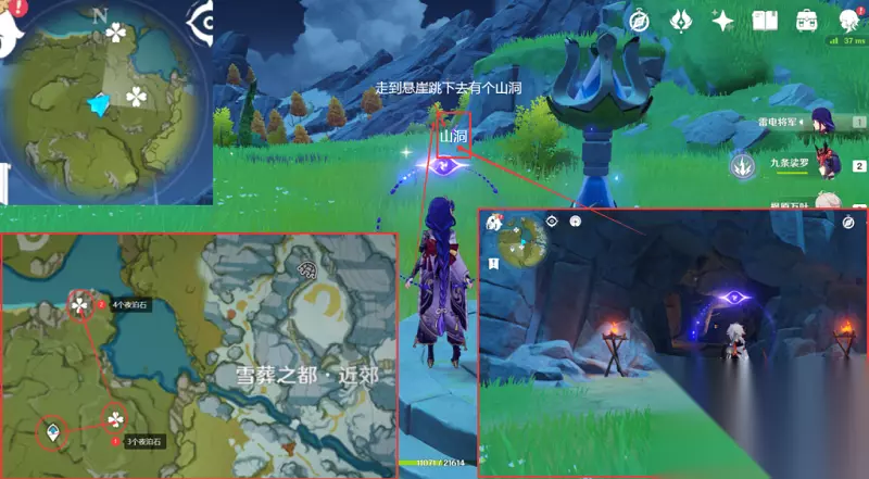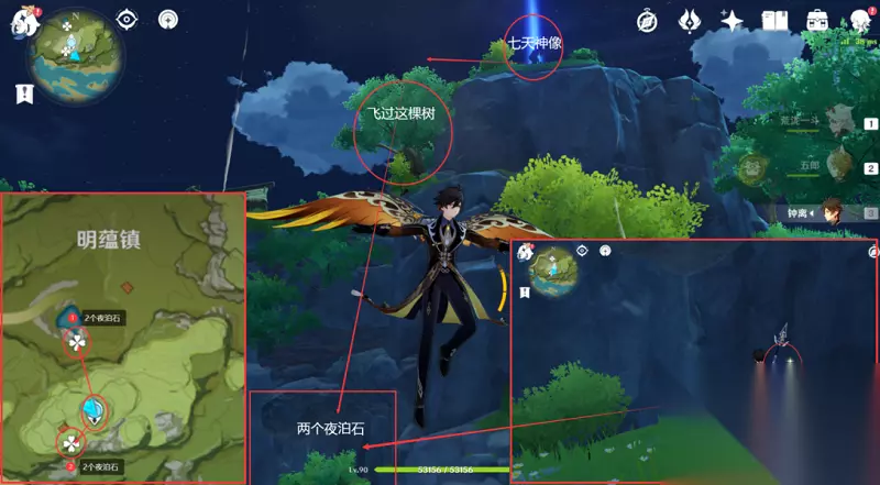 路线3:4个夜泊石 1,玩家需要前往明蕴镇下方的七天神像的位置,之后向着小地图的西南方向前进,飞过大树,之后就可以在下方看到一个小洞,这里可以获取两个夜泊石。