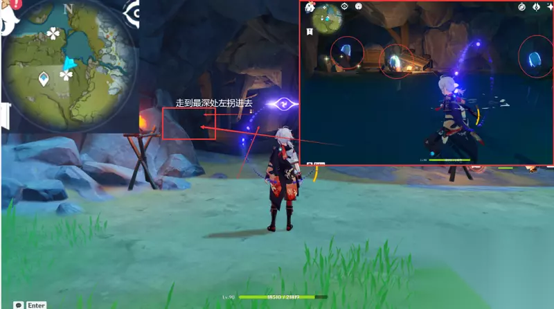 2,之后就可以从山洞的位置进去,进入之后向前走到最里面接着左拐,就可以在左手边看到三个夜泊石。