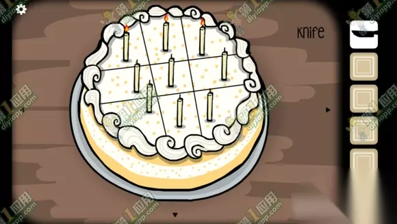 这个蛋糕要切四刀 让每块上都有且仅有一根蜡烛。(井字形来切记可。圆形上面划井字,这样正好分成九块。所有蜡烛即可点着。)就像这样: