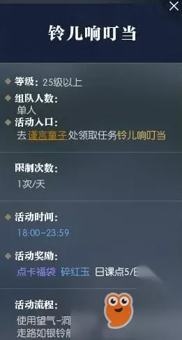 等级:25级以上 组队人数:单人 活动入口: 去谨言童子处领取任务铃儿响叮当 限制次数: 1天/次 活动时间: 18:00-23:59 活动奖励: 点卡福袋 碎红玉 曰课点5/曰 活动流程 使用望气-调悉技能.寻找逆水寒中走路如银铃般的人.据说在汴京城中