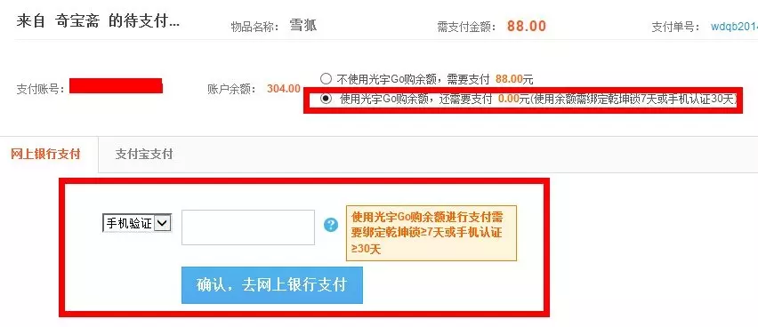 ★技巧2:不要先充值再下单 提醒1:充值了万一没抢到东西,充值的钱只能花,提现不出来的,所以最好是先先抢到订单了再充值,以免麻烦 提醒2:抢到了东西下了订单是有15分钟的时间在光宇Go购里面付钱的,超过了15分钟就要3个小时才能买同一个东西了 提醒3:抢到了订单后点了确认去光宇Go购支付就直接支付,不用余额是不需要乾坤锁绑定7天或者手机绑定30天的……如果你要用余额那就绑乾坤锁或者手机够天数了再说。 5、下单后如何支付 ★技巧1:不使用余额支付,不需要验证密保、手机,也不验证密保和手机绑定天数!