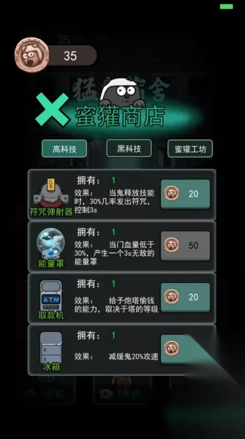 四、蜜獾商店 1、玩家每次结束游戏都可以获得一定数量的蜜獾币,点击右上角蜜獾商店,在里面不断升级自己的属性; 2、让玩家在接下来获得额外的攻防属性游戏,这里让你轻松面对怪物的攻击。
