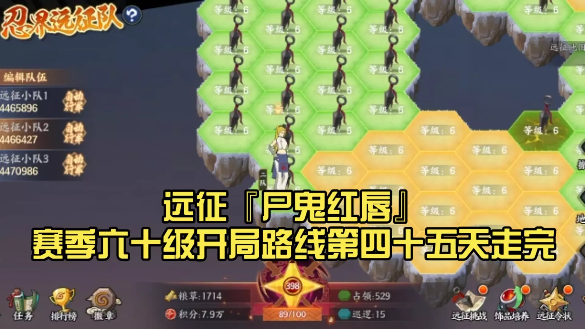 这是忍界远征队“尸鬼红唇”赛季六十级开局第四十六天的通关内容,展示了远征小队在远征地图的移动、地块占领,以及6级普通战斗的挑战与奖励获取,可参考该远征路线推进游戏进程。
