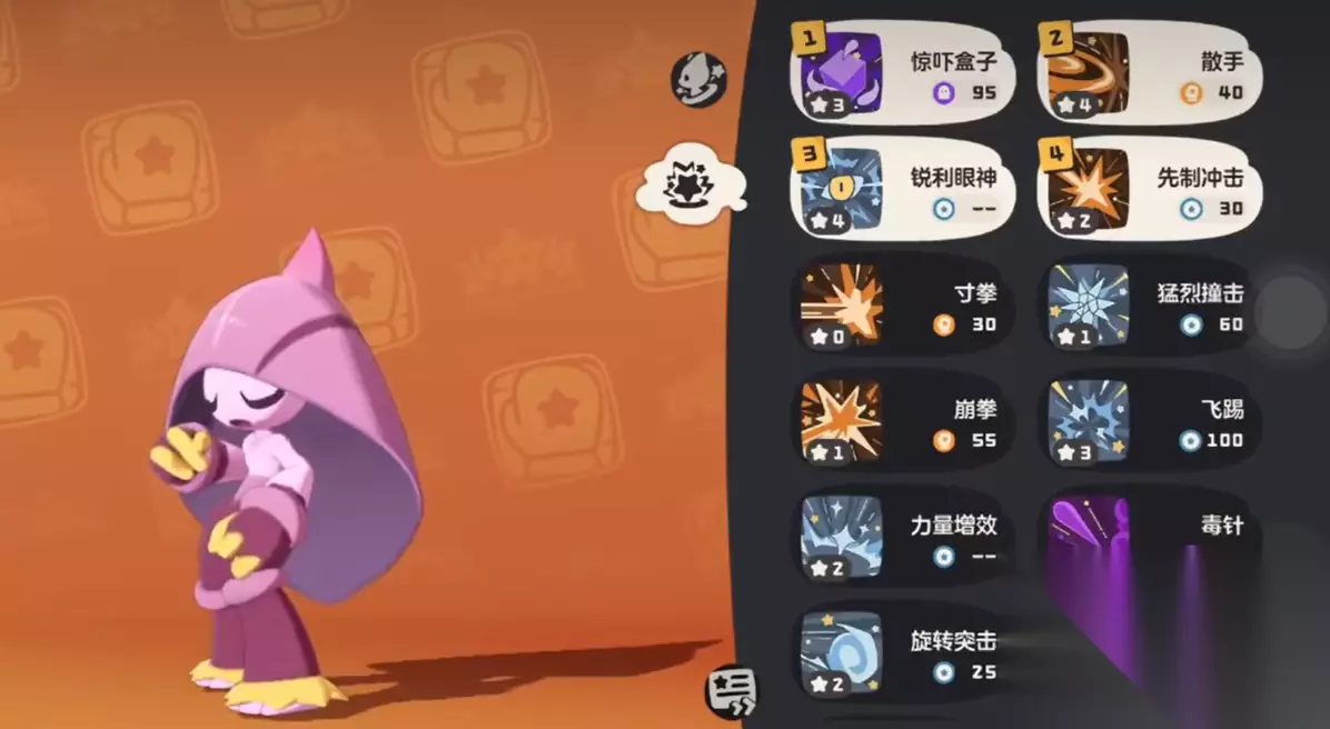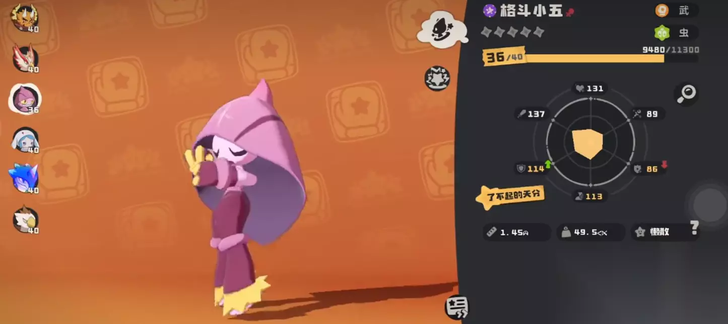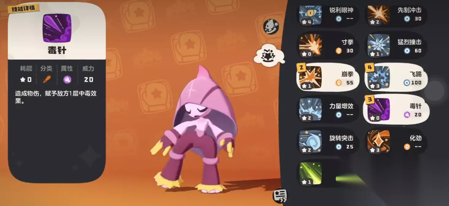 格斗小五的输出方式非常直接,几乎不需要花太多心思就能让它成为一名稳定的输出手。它的核心技能包括近身拳和炎爆拳。近身拳作为高威力单体攻击,可以迅速解决掉敌方的关键目标。而炎爆拳则是一个火系的范围攻击技能,专门用来应对草系或冰系敌人,打得敌人措手不及。想要在战斗中保持高效的输出,基本上这两招是必备的。
