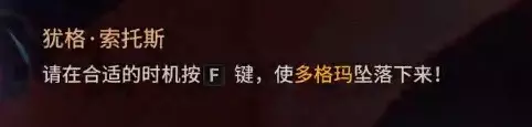 打破第二个铁门,BOSS就出场了。 血量:破灭之影-多格玛是一条体型巨大的飞龙,血量194T,人数不影响血量。 通关条件:必须在14分钟内击杀。 机制①:多格玛飞翔 需要安排4名队友,按F键骑到多格玛上。当光标移动到浅蓝色区域时,按F键即可让BOSS翅膀受伤害。如果进度条在结束前没满,会团灭。其余队友在地面上注意躲避飞龙的火焰攻击,建议留几个蓝鹰在地面,没地方躲时,队友集中在一起开无敌罩子。