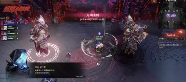 机制④:分身蓄力 黑暗与光明奎拉斯蓄力准备展开毁灭性攻击,玩家需在此时破坏两个分身的护盾。 分身脚下有护盾值显示,如果护盾没有被打破,BOSS蓄力结束会向前发射半屏攻击。假如有一个分身的护盾没破,可以跑到它背后躲掉半屏攻击,也可以利用无敌技能躲掉。